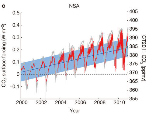 Figure 2 As measured at the North Slope Alaska (NSA) measurement site, the growth in CO2 heating effect is shown in red, and in grey the concentration of CO2 estimated to be in the bottom 2 km of the atmosphere is shown. The CO2 heating effect is in Watts per square metre, and the amount of CO2 in parts per million.