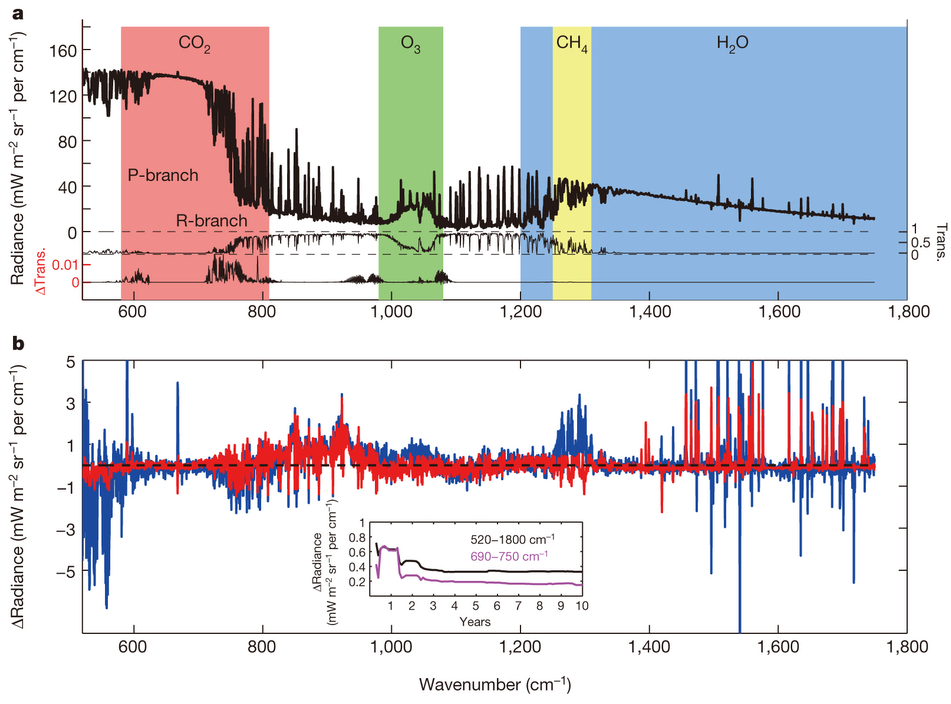 Figure 1 The top is what a spectrum looks like, with the radiance (think "brightness") at each different frequency (reported here as wavenumber). The left shaded red bit is mostly from CO2, and can be separated from the effect of other things like water vapour. The bottom shows, in red, the difference between the computer simulation and the measurements over March 2001. Differences in the CO2 region are mostly less than 0.5 units, out of total measurements of up to 140 units.