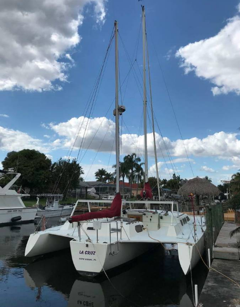 Supposedly built in 1986 in Melbourne, FL and the third tri constructed by that builder. The hulls are foam cored but the bulkheads and deck are ply cored (?). The current owner added the rigid cockpit enclosure